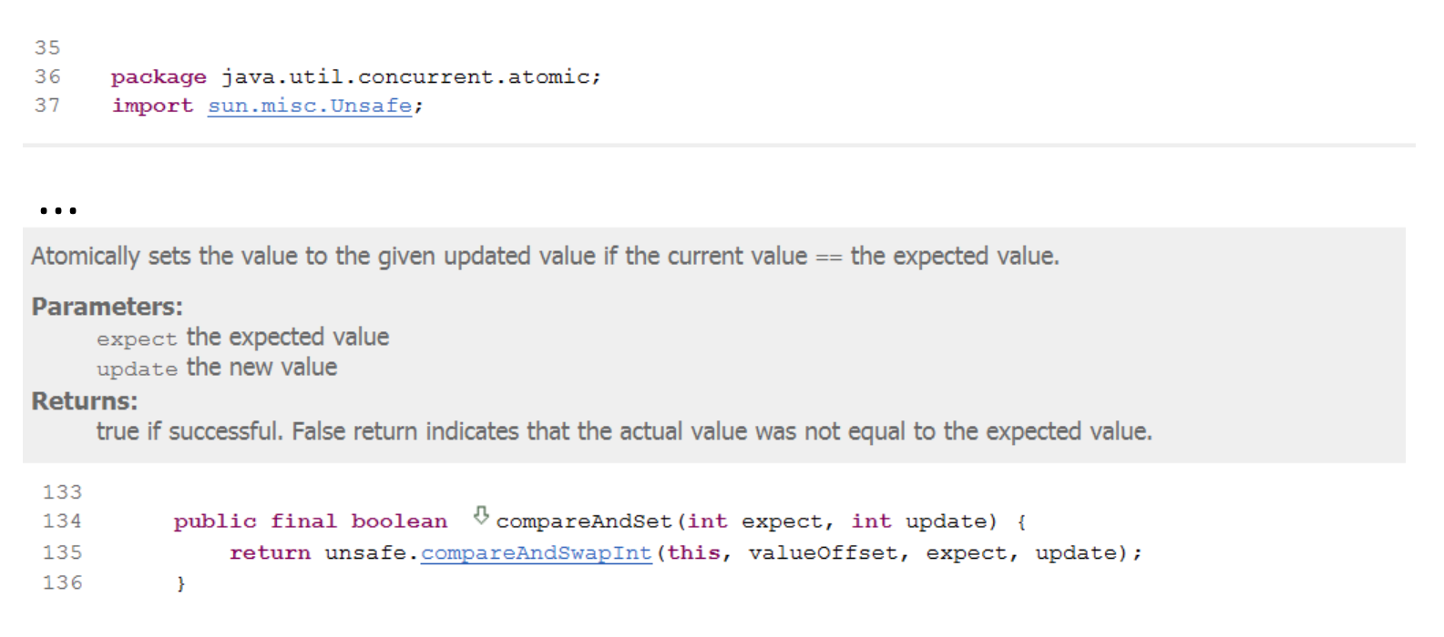 sun.misc.Unsafe(escape patch). sun.misc.Unsafeprovides methods that map directly (or as closely as possible) to underlying hardware atomic operations (like CAS).- This mapping is not strictly guaranteed, and the performance/lock-free nature depends on the specific JVM, OS, and hardware.