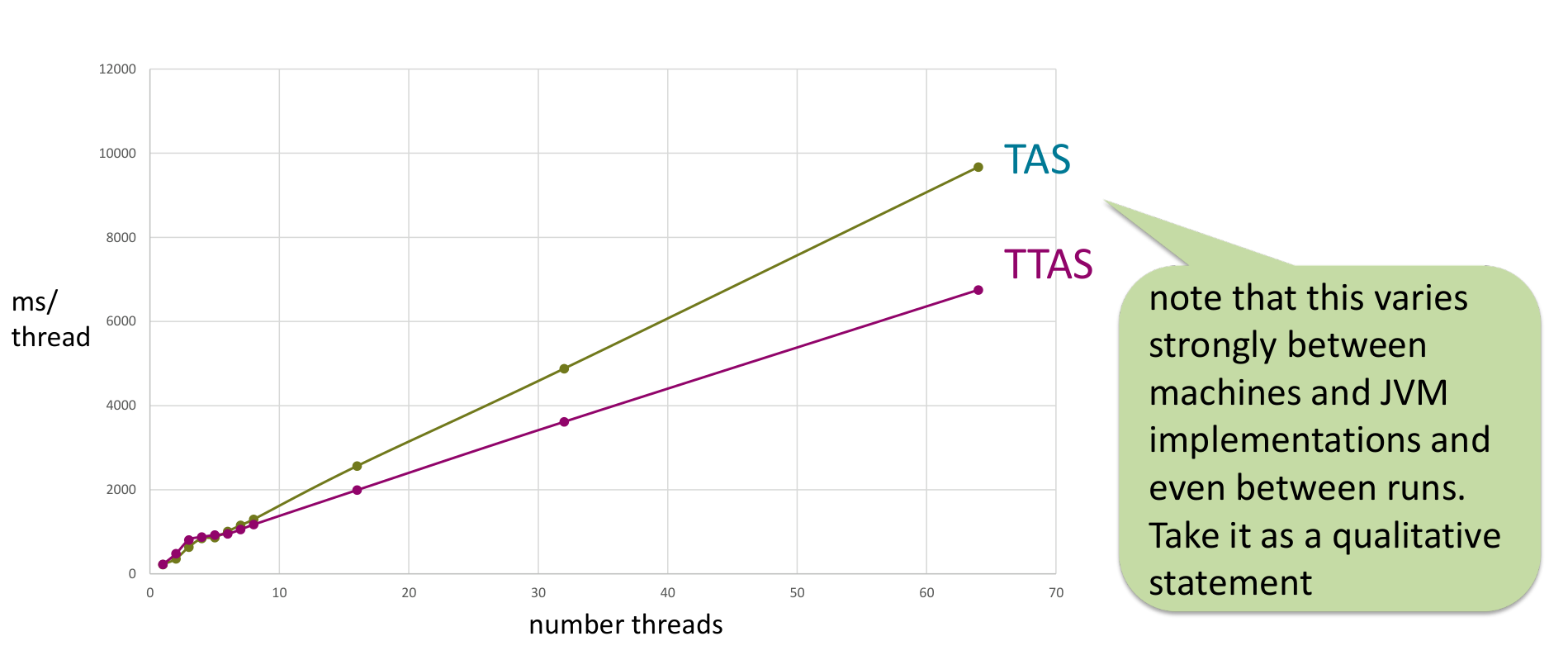Measurement: The graph shows TATAS performs much better than TAS, although runtime still increases with the number of threads due to contention during the actual atomic attempt phase. (Note: Performance varies significantly across machines/JVMs; this is qualitative.)