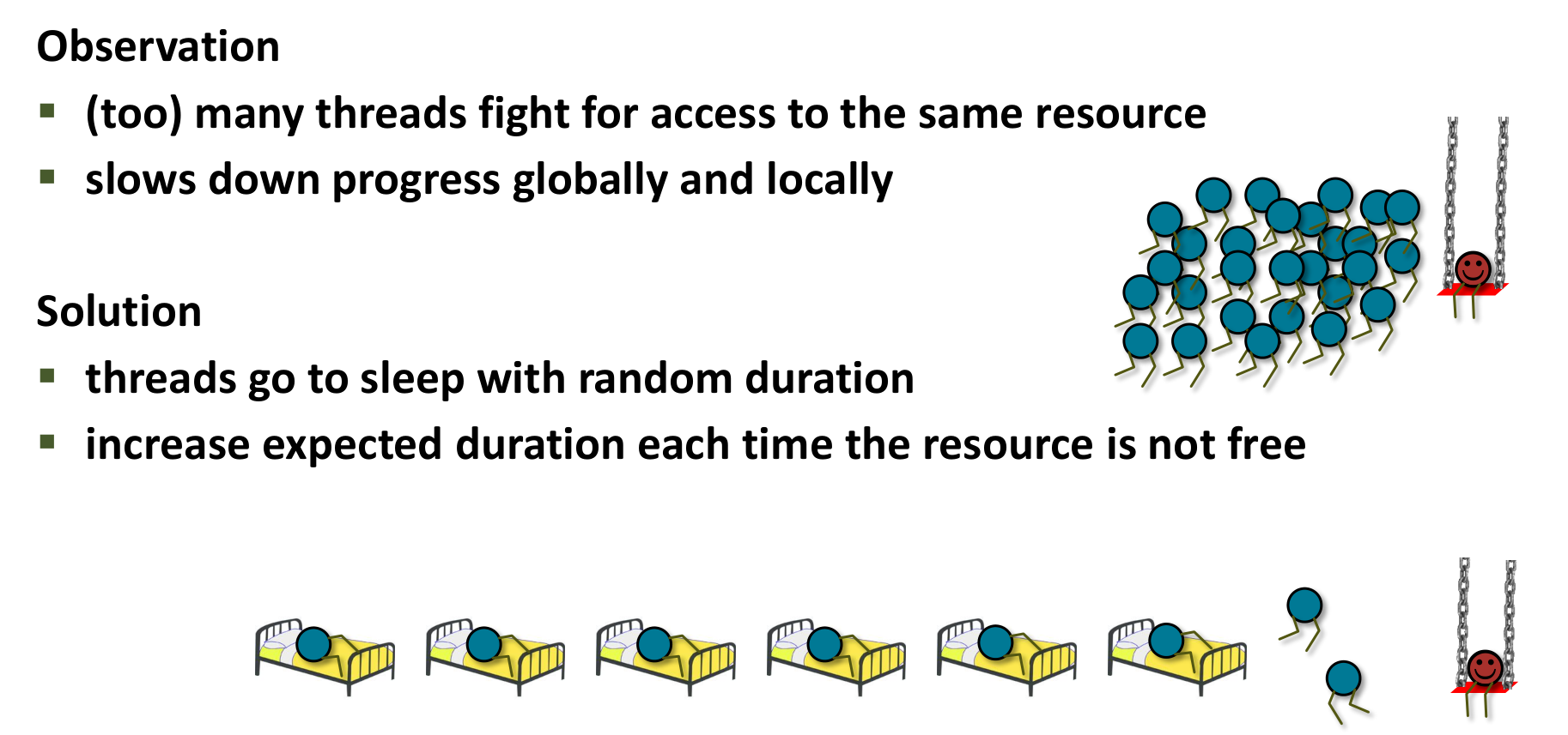 Solution: Backoff: When a thread fails to acquire the lock (i.e., the atomic operation fails because someone else got it first), it shouldn’t immediately retry. Instead, it should back off – wait for a short duration before trying again.