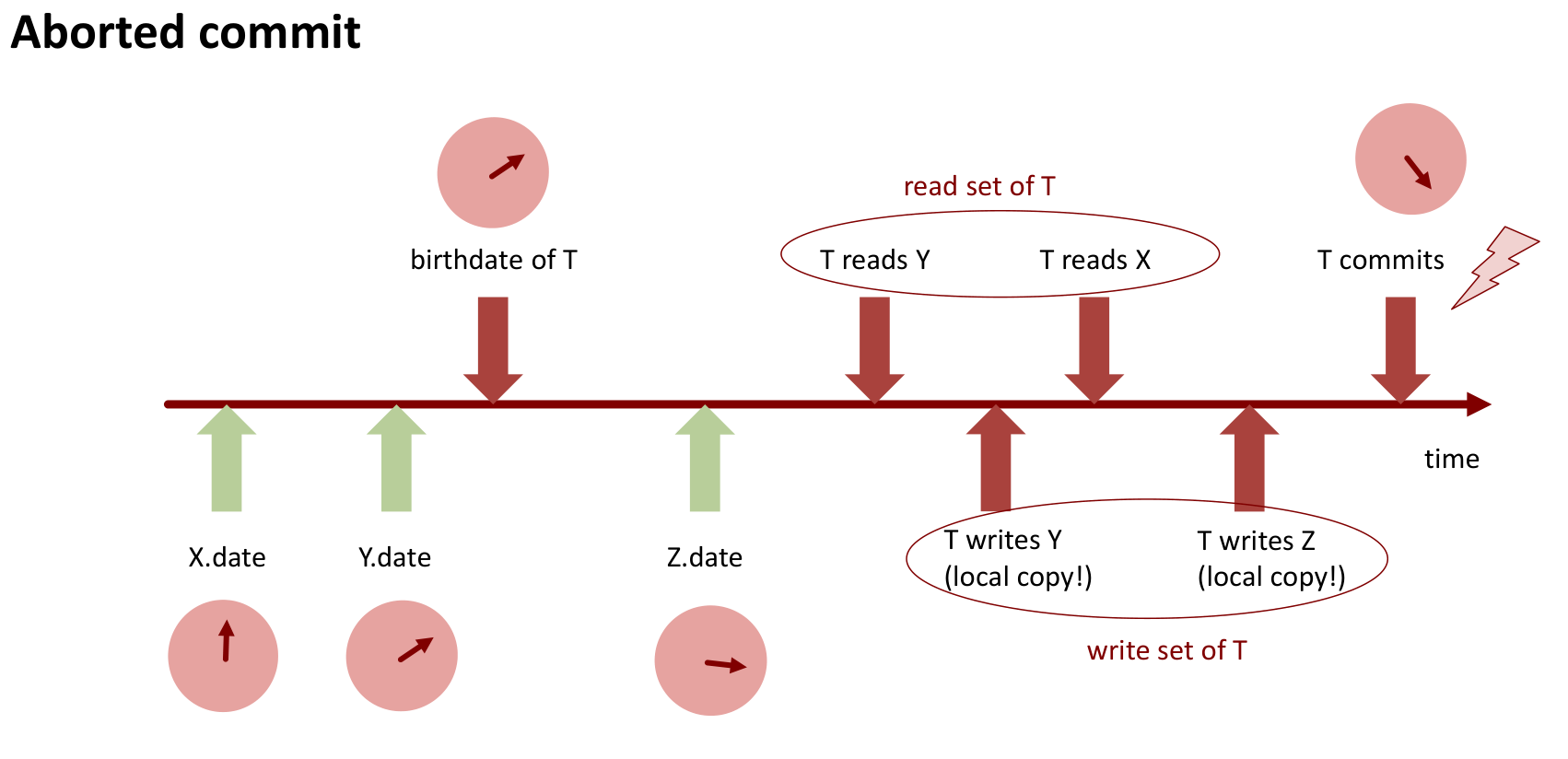 This timeline illustrates an aborted commit. T reads Y and X, writes locally to Y and Z. Before T attempts to commit, another transaction commits and updates the timestamp of Z (Z.date) to be greater than T’s birthdate. When T attempts to commit, it locks Y and Z. During validation (step 2), it detects that Z.timestamp > T.birthdate. The validation fails, T releases the locks, discards its write-set (local copies of Y and Z), and aborts.