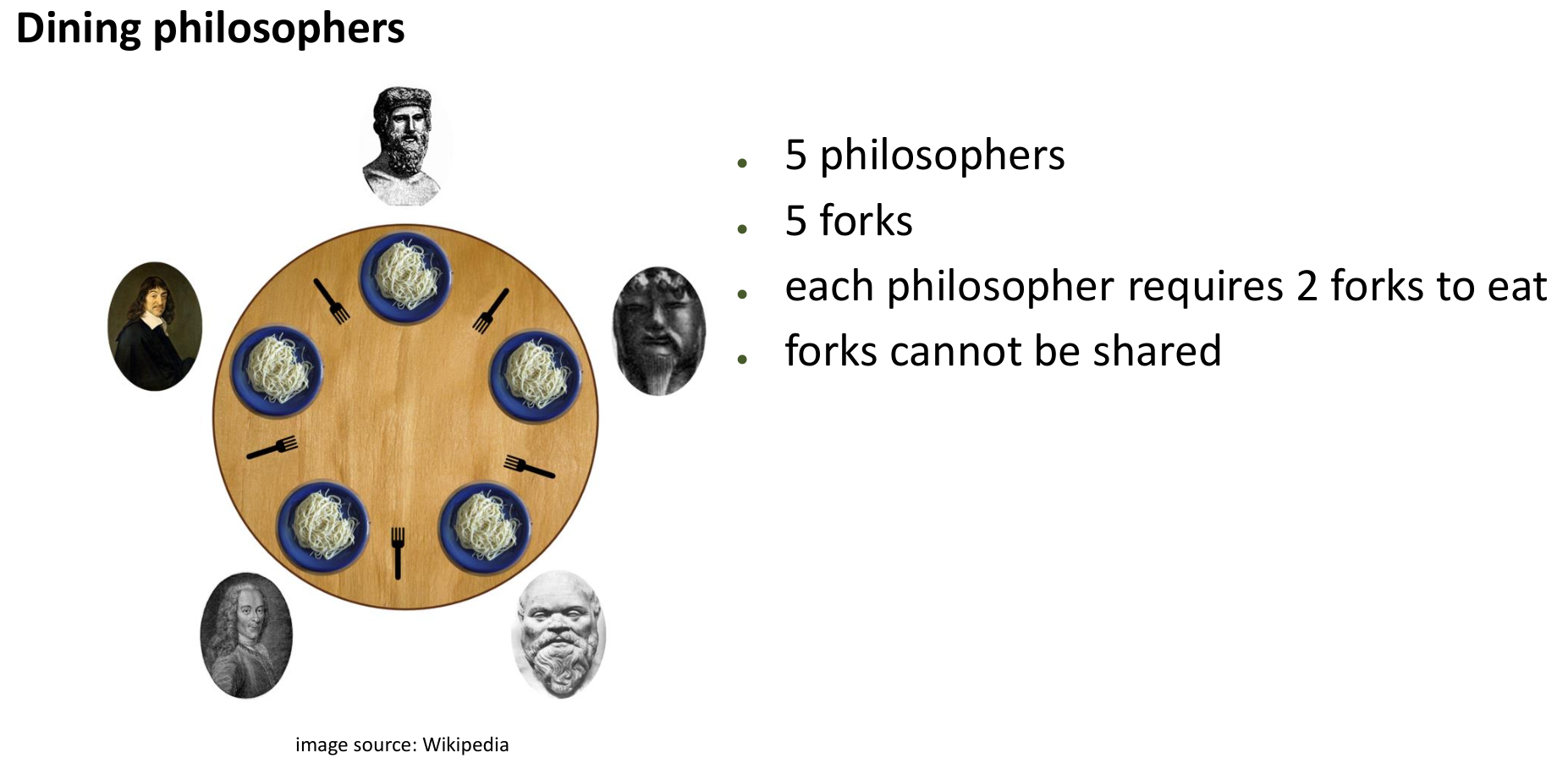 5 philosophers sit at a round table with 5 forks placed between them. Each philosopher alternates between thinking and eating. To eat, a philosopher needs exclusive access to both the fork on their left and the fork on their right. Forks cannot be shared simultaneously.