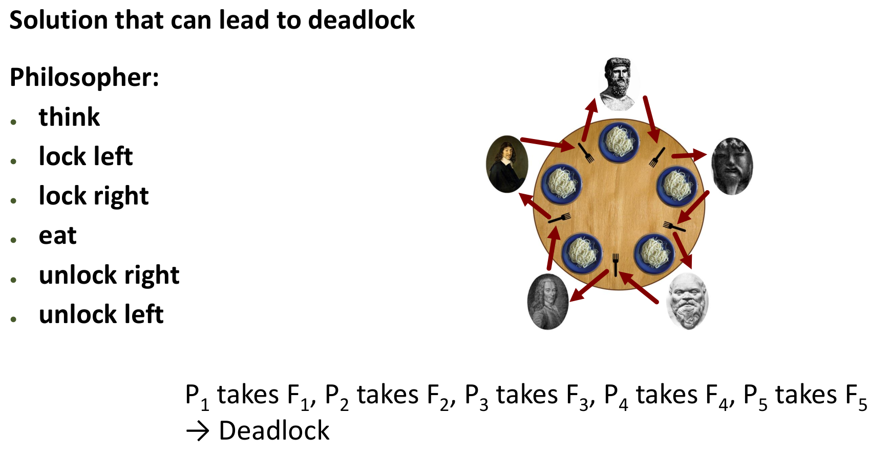 A naive solution where each philosopher locks their left fork then their right fork leads to deadlock if all philosophers pick up their left fork simultaneously. Solutions involve complex strategies like lock ordering or breaking symmetry.