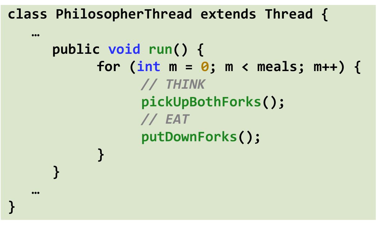 runmethod is simple: loop for a number of meals,// THINK,pickUpBothForks(),// EAT,putDownForks().