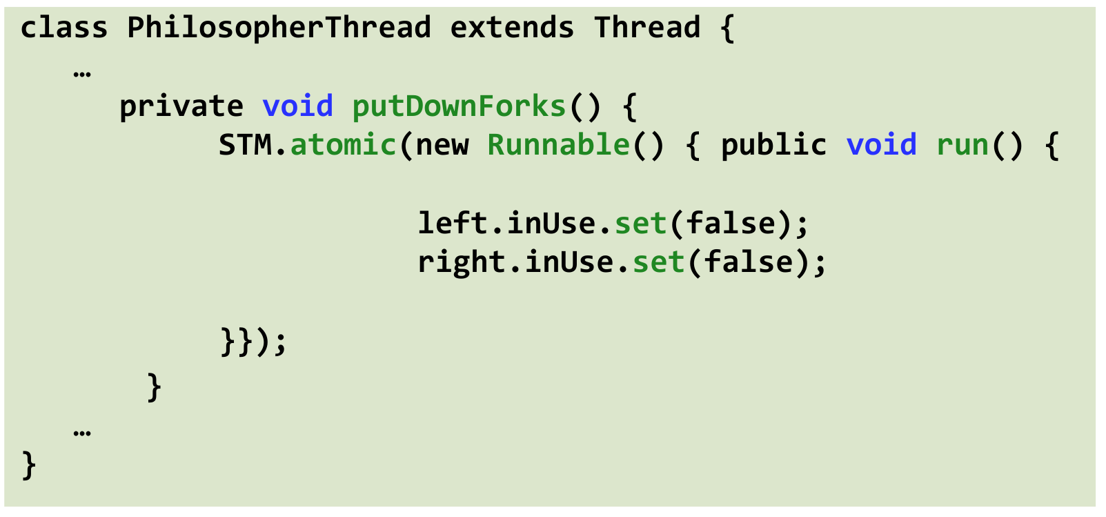 STM.retry(). This aborts the current transaction attempt and puts the philosopher thread to sleep. The STM system will automatically wake and retry the transaction later when one of the variables read in this transaction (i.e.,left.inUseorright.inUse) is modified by another committing transaction (specifically, when a fork is put down). - Acquire: If both forks are free (