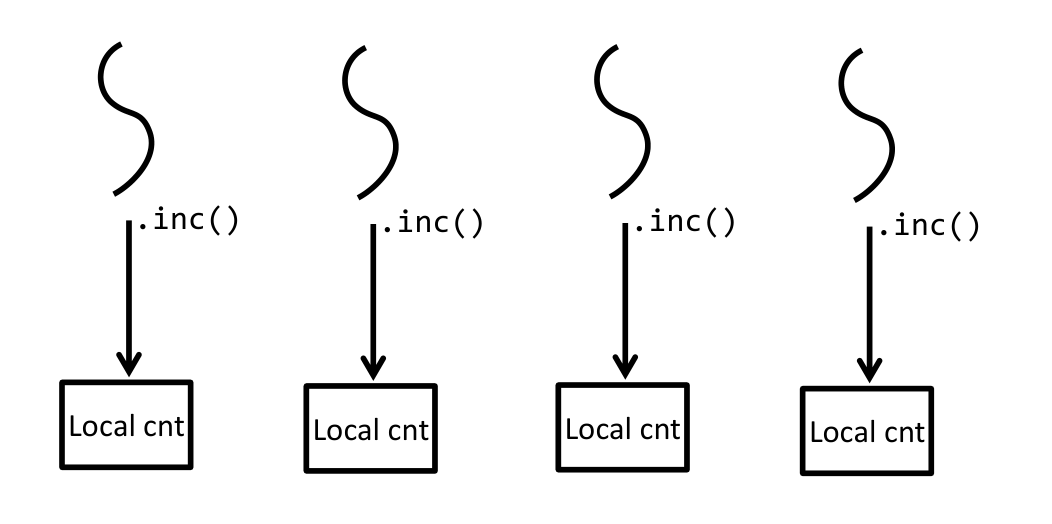In the isolated state model, each of the four tasks maintains its own private Local cnt. Increment operations are purely local and require no inter-task synchronization.