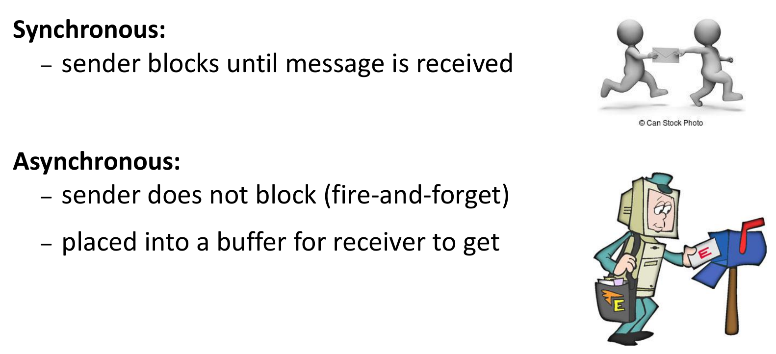 sendblocks until the receiver accepts the message. Provides tight synchronization. - Asynchronous: