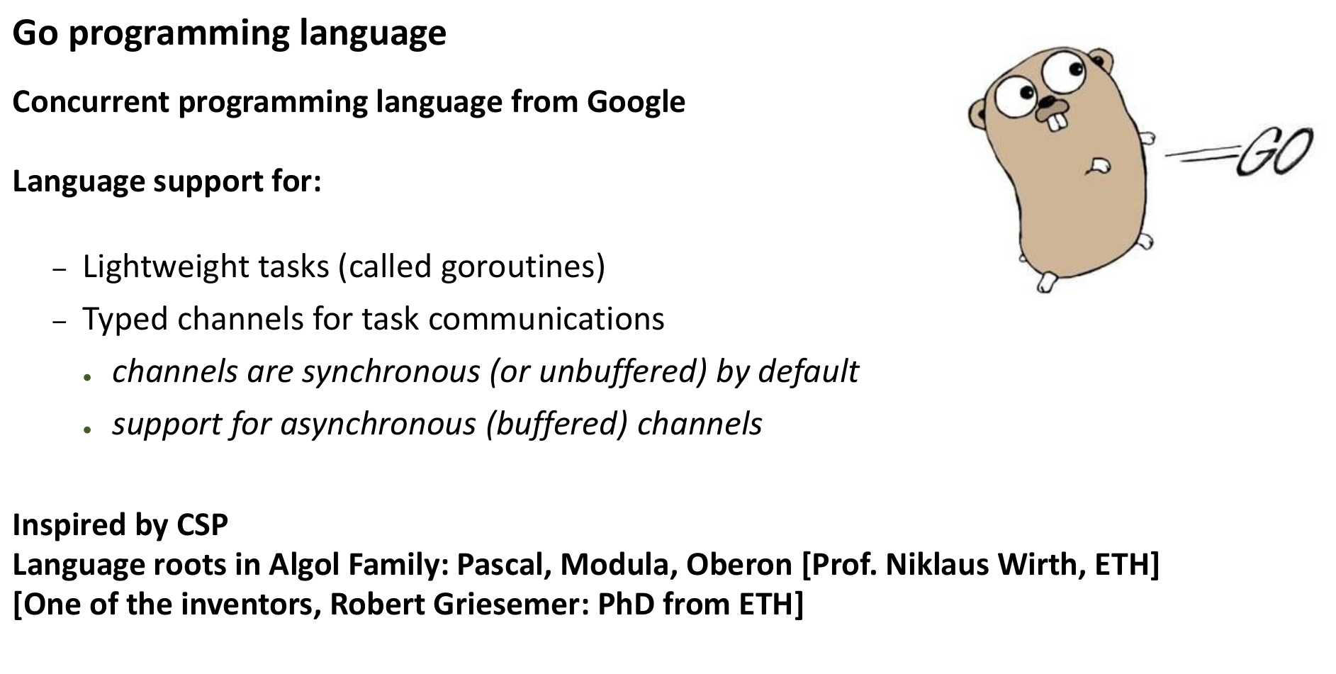 - Briefly mention programming models (CSP, Actors, Go) and the MPI standard.