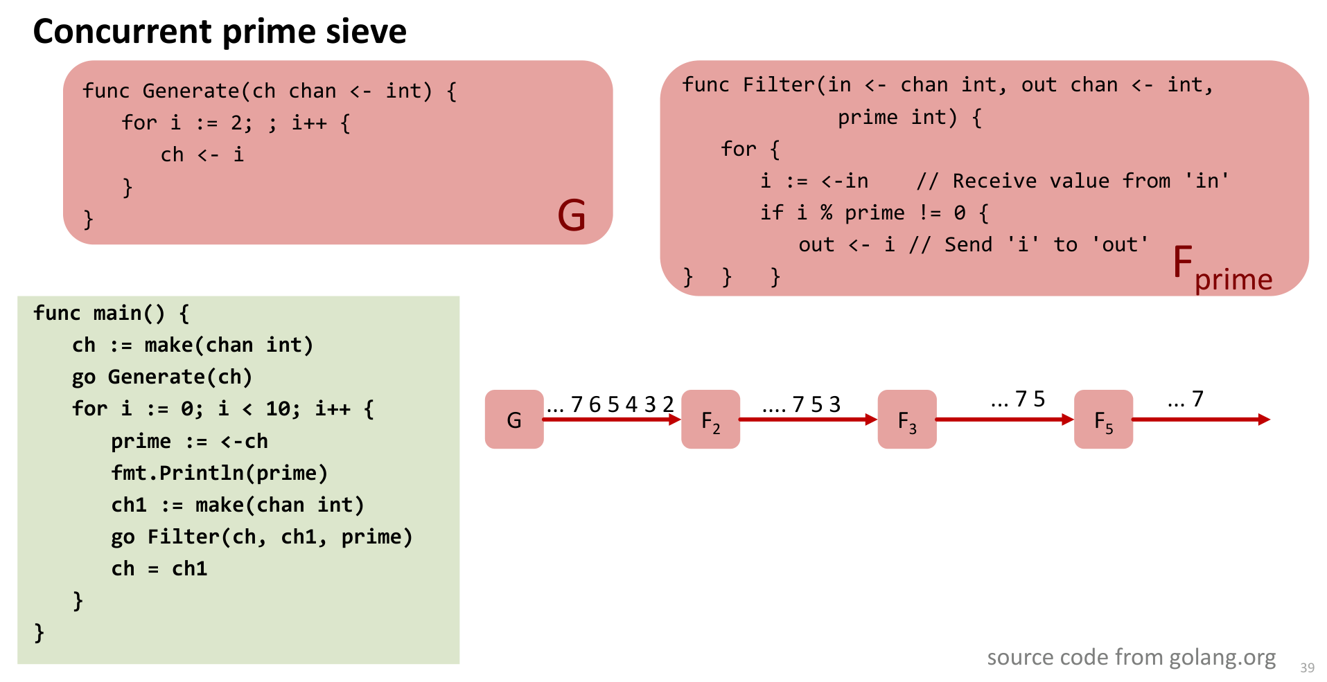 The Go code implements this using channels. Generate sends numbers. Filter receives, filters multiples of its prime, and sends remaining numbers to the out channel. main dynamically creates the pipeline stage by stage.