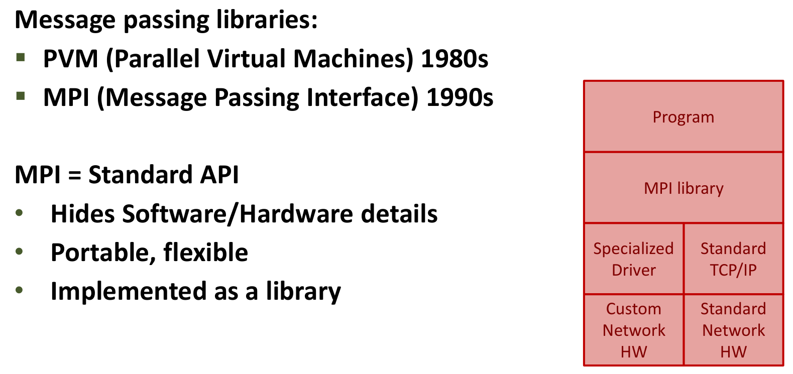 - Library Standard: MPI (Message Passing Interface) is the dominant standard library for high-performance computing on distributed memory systems.