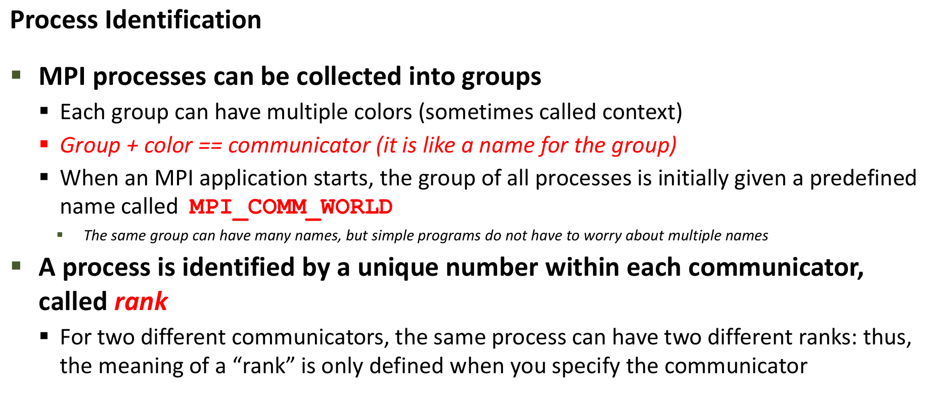 - Processes & Groups: An MPI execution consists of multiple independent processes. Processes can be organized into groups.