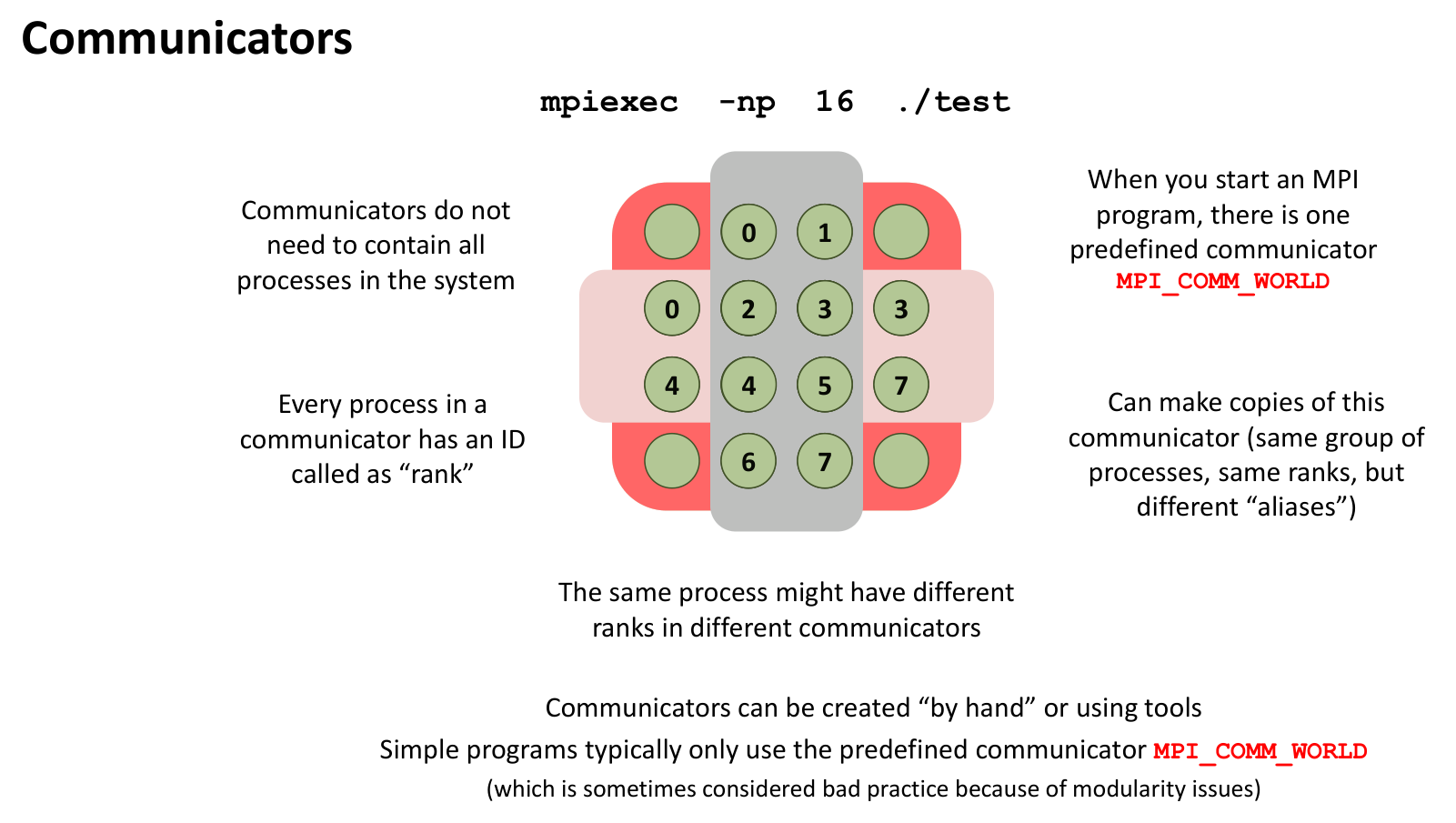 - Communicators: A communicator object defines a communication context, encompassing a specific group of processes that are allowed to communicate with each other using that communicator.