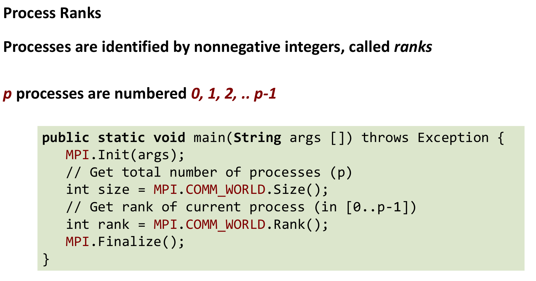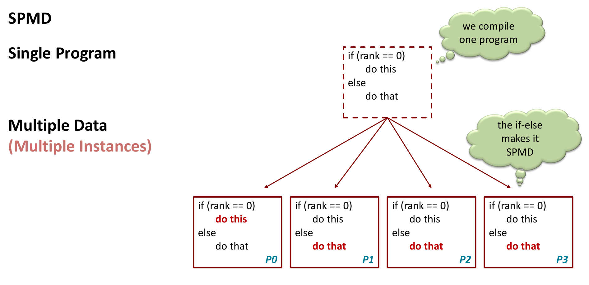 Most MPI programs use the Single Program, Multiple Data (SPMD) model. The same compiled code runs on all processes, but if (rank == ...) statements control execution paths based on the process rank.