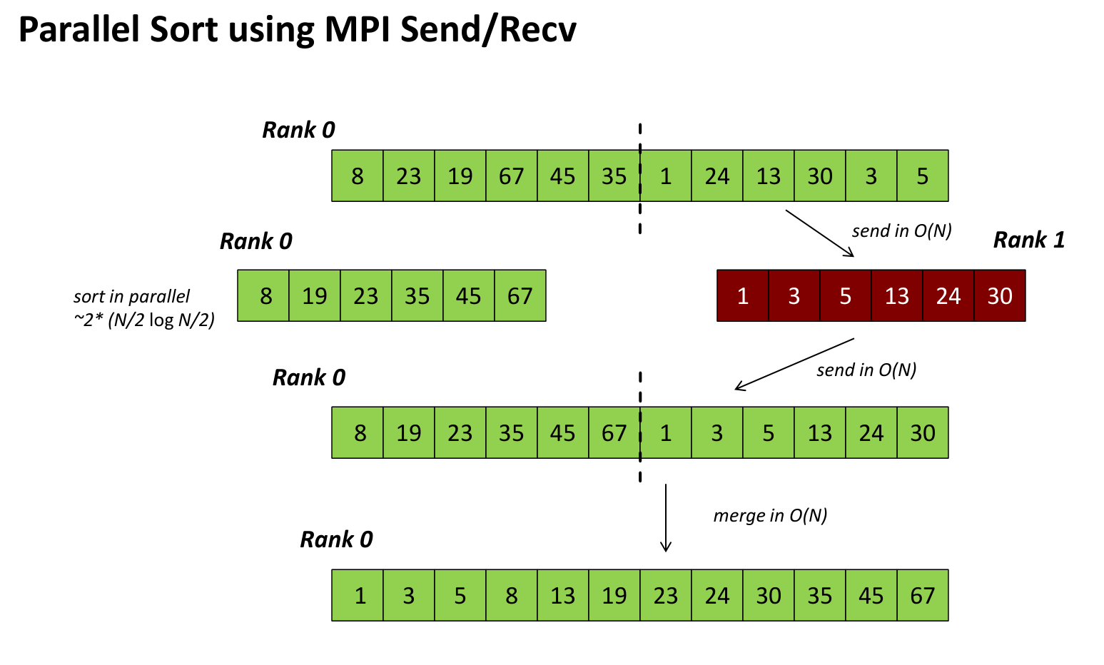 A simple parallel sort can use MPI_Send and MPI_Recv to distribute data, sort locally, and merge results, illustrating basic message passing coordination.