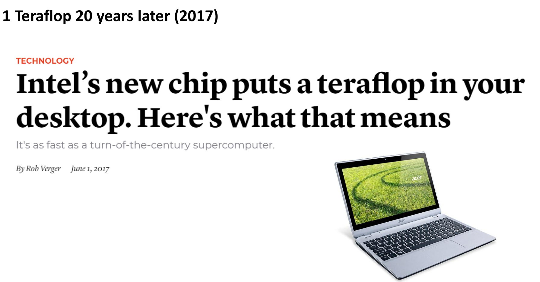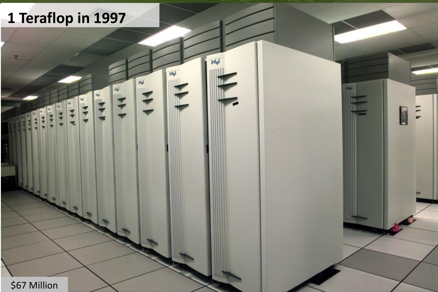 Achieving one Teraflop (10^12 floating-point operations per second) required a $67 Million supercomputer, ASCI Red, occupying a large room in 1997.