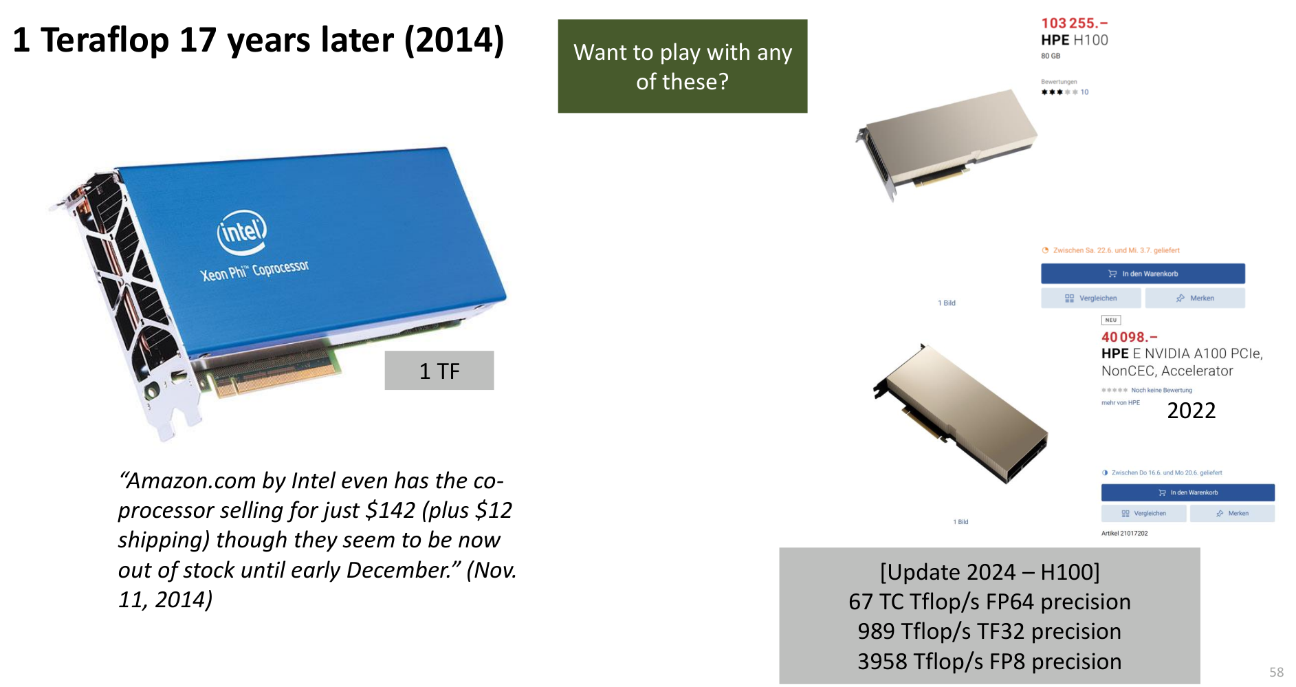 Just 17 years later, in 2014, Intel’s Xeon Phi co-processor offered similar performance on a single PCIe card for a few hundred dollars. And today (Update 2024), a single NVIDIA H100 GPU delivers nearly 1000 TFlop/s in TF32 precision for AI tasks, and almost 4000 TFlop/s in lower FP8 precision – an astonishing increase.