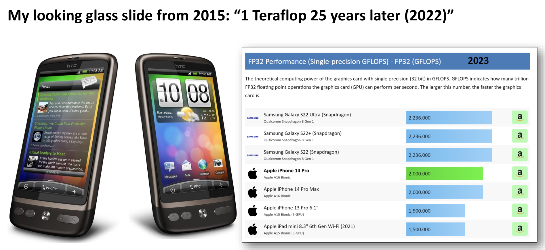 The prediction from 2015 that we’d see a Teraflop in mobile devices within about 7 years (by 2022) turned out to be remarkably accurate, with high-end smartphone chips achieving this level of performance by 2023.