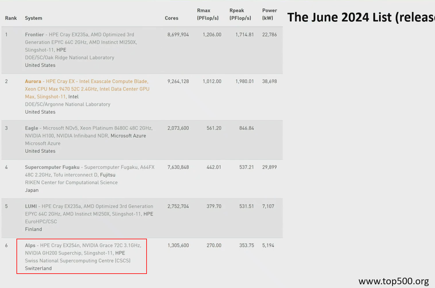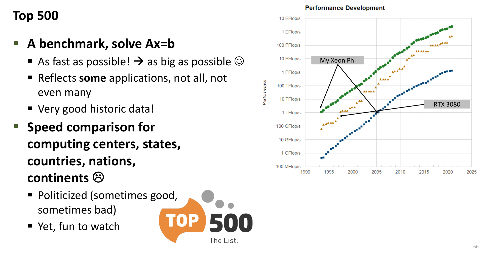 The Top500 list provides a long-standing (though sometimes criticized) benchmark for the world’s fastest supercomputers, primarily based on solving a large dense linear system (Ax=b) using the Linpack benchmark. While not perfectly representative of all applications, it offers valuable historical data and drives competition and innovation in the HPC community.