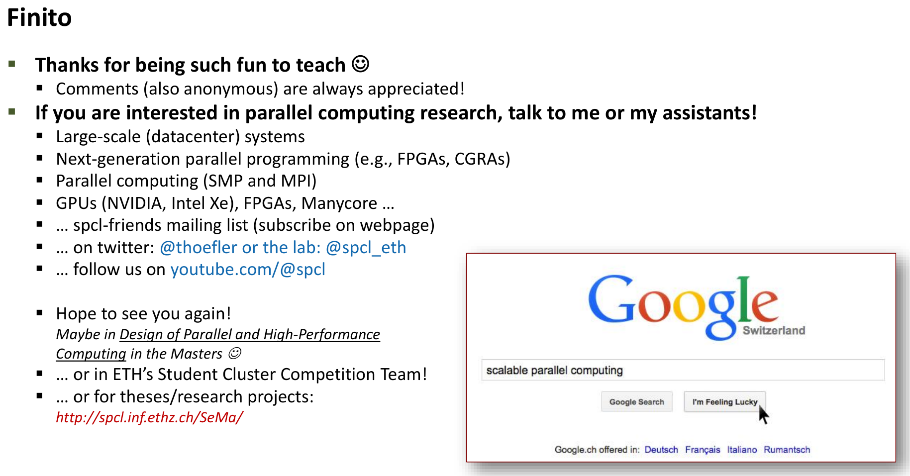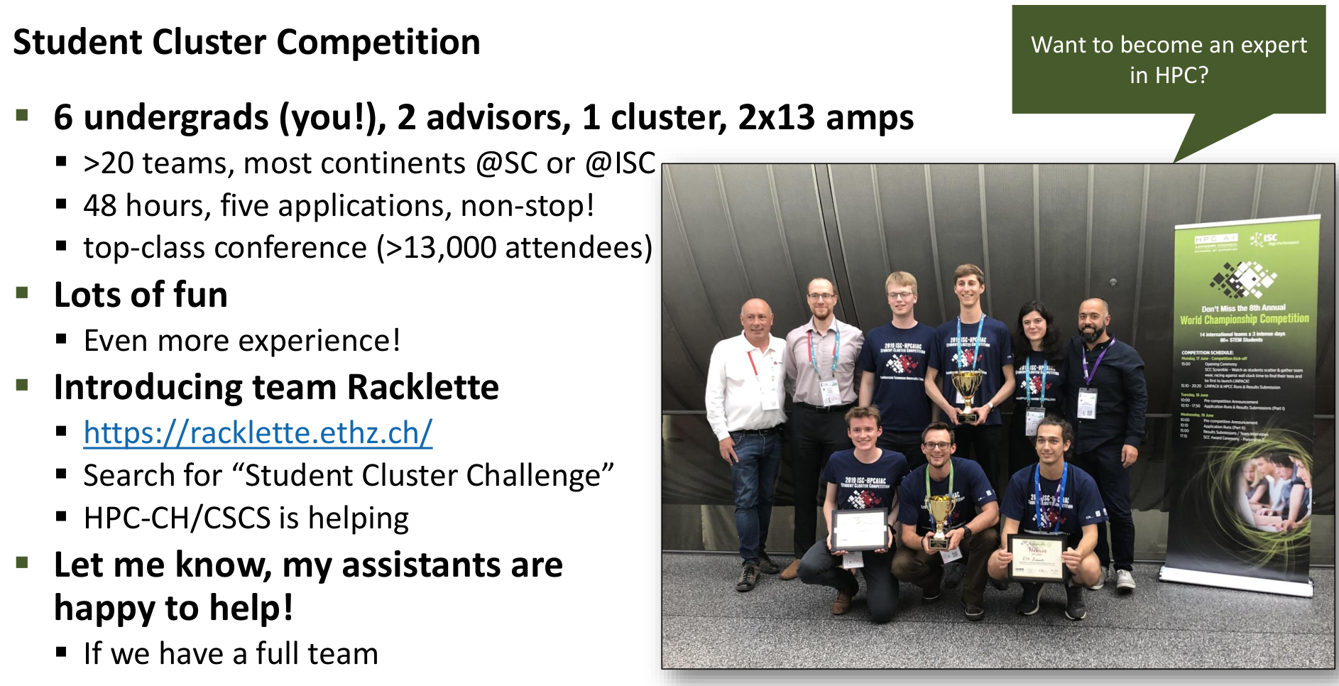 For students interested in gaining hands-on HPC experience, the Student Cluster Competition (SCC), held at major conferences like ISC (Germany) and SC (USA), is an incredible opportunity. Teams of undergraduate students design, build, and operate a small cluster, running real scientific applications under challenging constraints (like power limits) over a non-stop 48-hour period. ETH has a successful team, “Racklette” (https://racklette.ethz.ch/) and CSCS provides support. Participating offers invaluable practical skills and exposure to the HPC community.