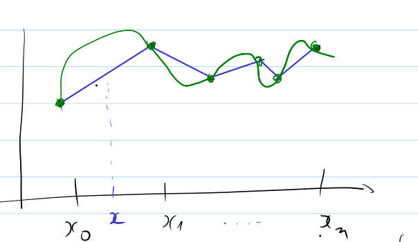 However, as was pointed out in the lecture, this approach has a significant drawback: the resulting function has sharp corners at each data point. It is continuous, but it is not differentiable at the points . For many physical systems, like the trajectory of a drone, we expect a smooth path without instantaneous changes in direction. We need a smoother solution.