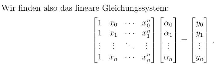 - Numerical Instability: The Vandermonde matrix is famously ill-conditioned. This means it is “almost singular.” Tiny rounding errors in your input data get magnified into enormous errors in the computed coefficients. As the lecturer stated, for even a moderate number of points, the results are “brutal schlecht” (brutally bad) and “völlig sinnlos” (completely senseless). Standard numerical software will even warn you not to trust the solution.