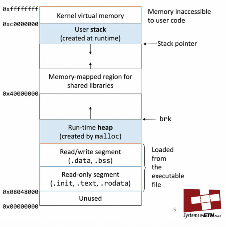 - Unused: The very lowest part of memory (around address 0) is intentionally left unmapped. This helps catch errors, as trying to use a