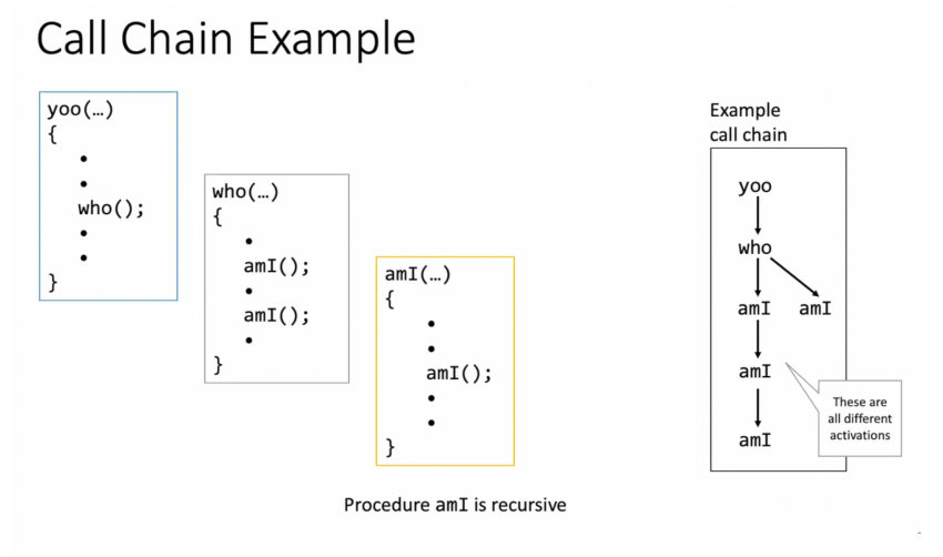 Languages that support recursion, like C, rely on a stack data structure to manage function calls. The code must be reentrant, meaning a single function can have multiple active instances at the same time (e.g., amI() calling amI()). Each instance needs its own private state.