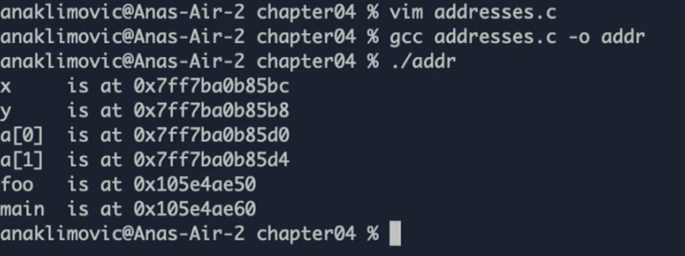 Notice that the local variables (x, y, a) have high memory addresses. This is because they live on the stack, which grows downwards from the top of the address space. The main function’s address is low because it lives in the read-only code segment.