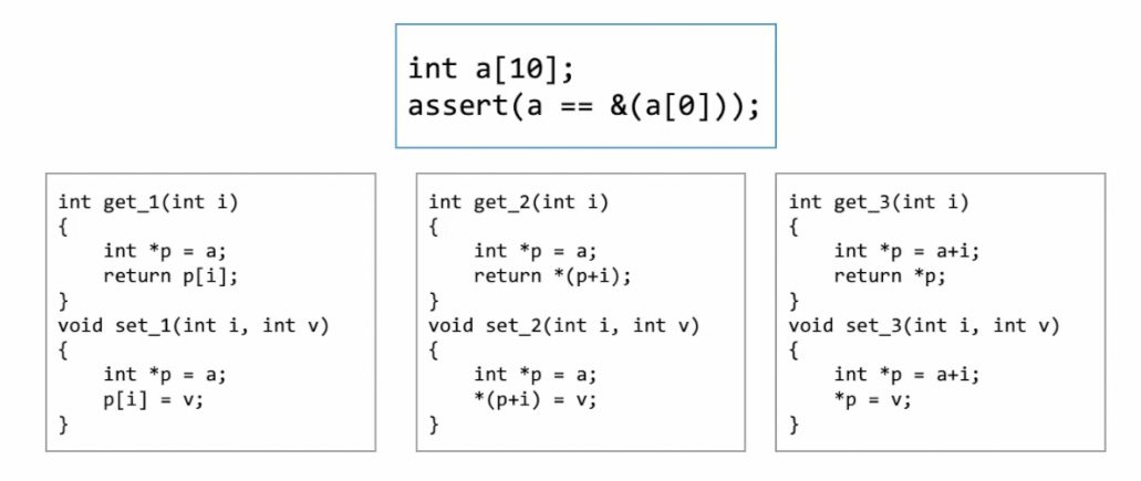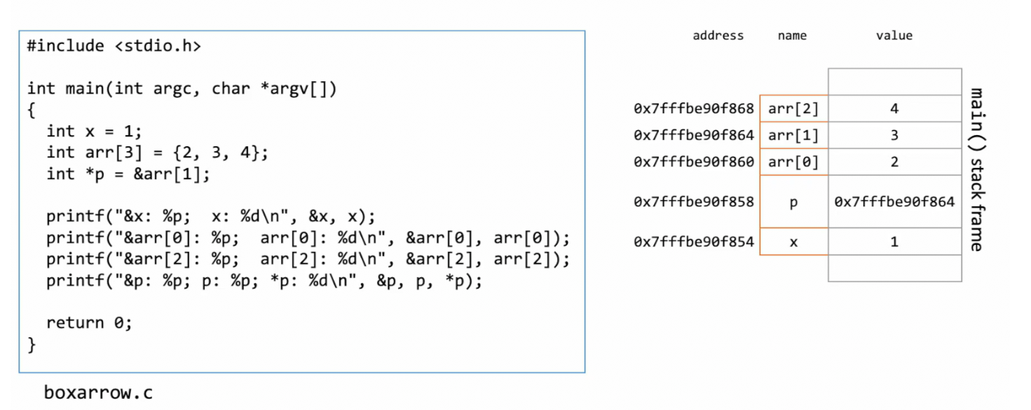 &:&agives you the address of the array itself. The value is the same asa(the starting address), but the type is different. It’s a “pointer to an array of 10 ints” (int (*)[10]), not a “pointer to an int” (int *). - When it’s a string literal used to initialize a