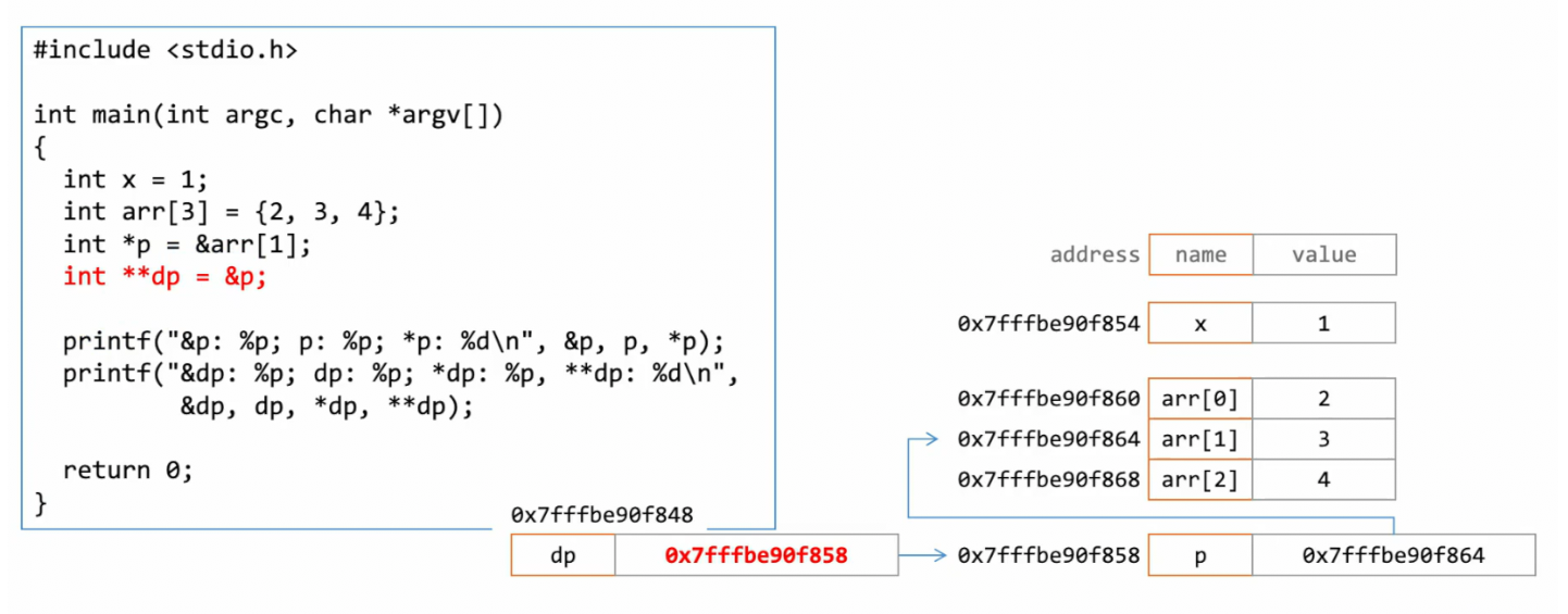 int **dp = &p; // dp points to p, which points to x.To get to the value of x from dp, you must dereference twice: **dp.