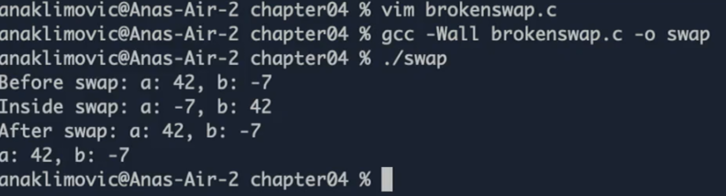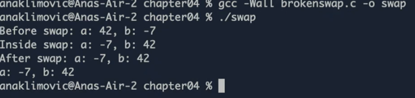 swapreceives the addresses ofxandy. By dereferencing those addresses, it directly manipulates the variables inmain’s stack frame, and the swap works as intended.