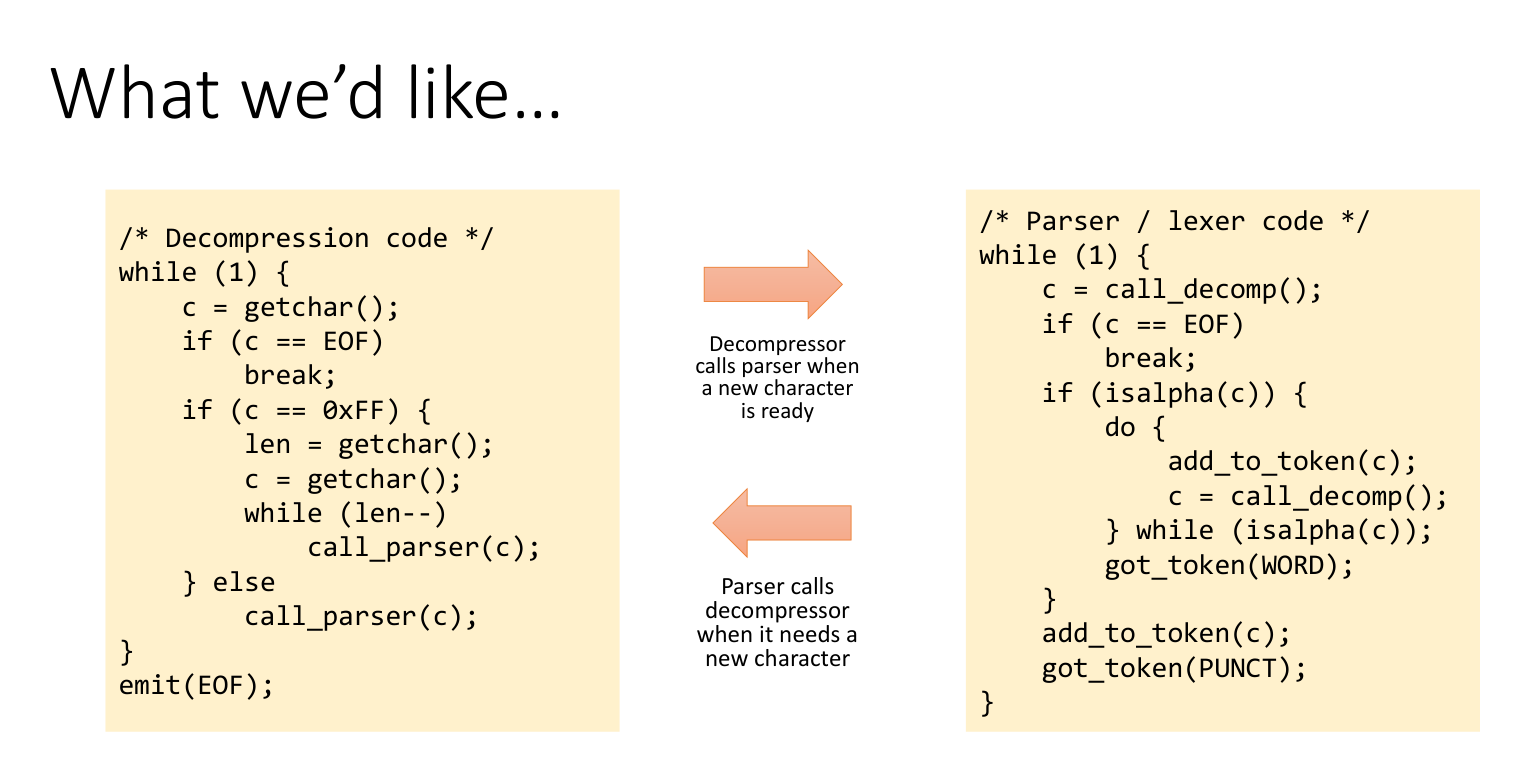 Imagine a decompressor that produces characters and a lexer that consumes them.