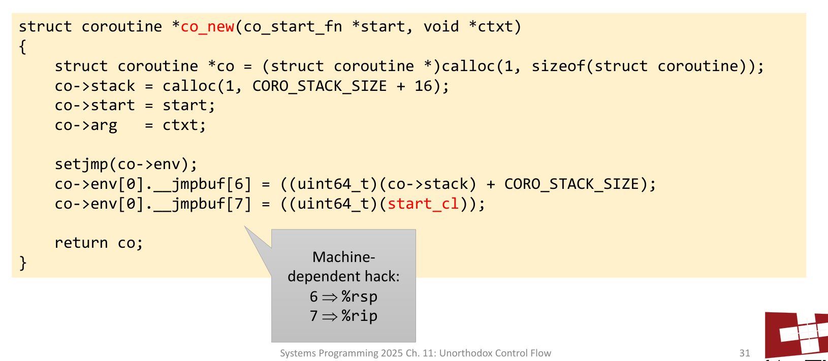 Starting a new coroutine is tricky because it doesn’t have a saved jmp_buf to jump to. This is solved with a small, machine-dependent hack.