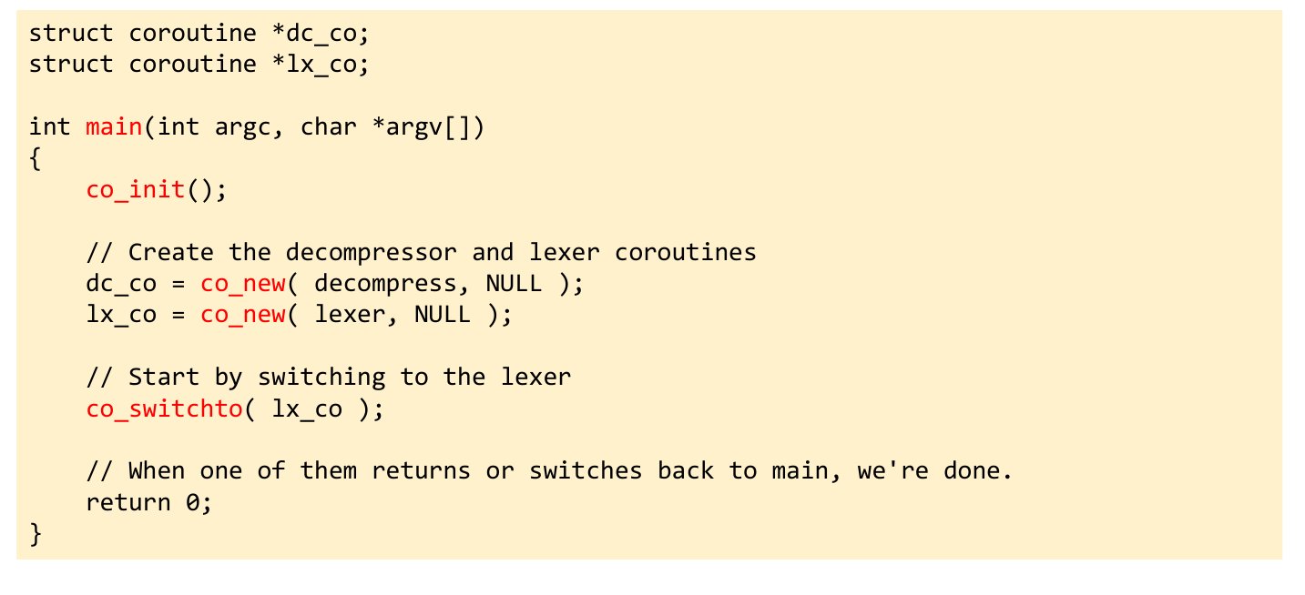 emit(c)becomes a macro:DEC_PUTCHAR(c)which isco_switchto(lexer_co).getchar()becomes a macro:LEX_GETCHAR()which isco_switchto(decompressor_co).