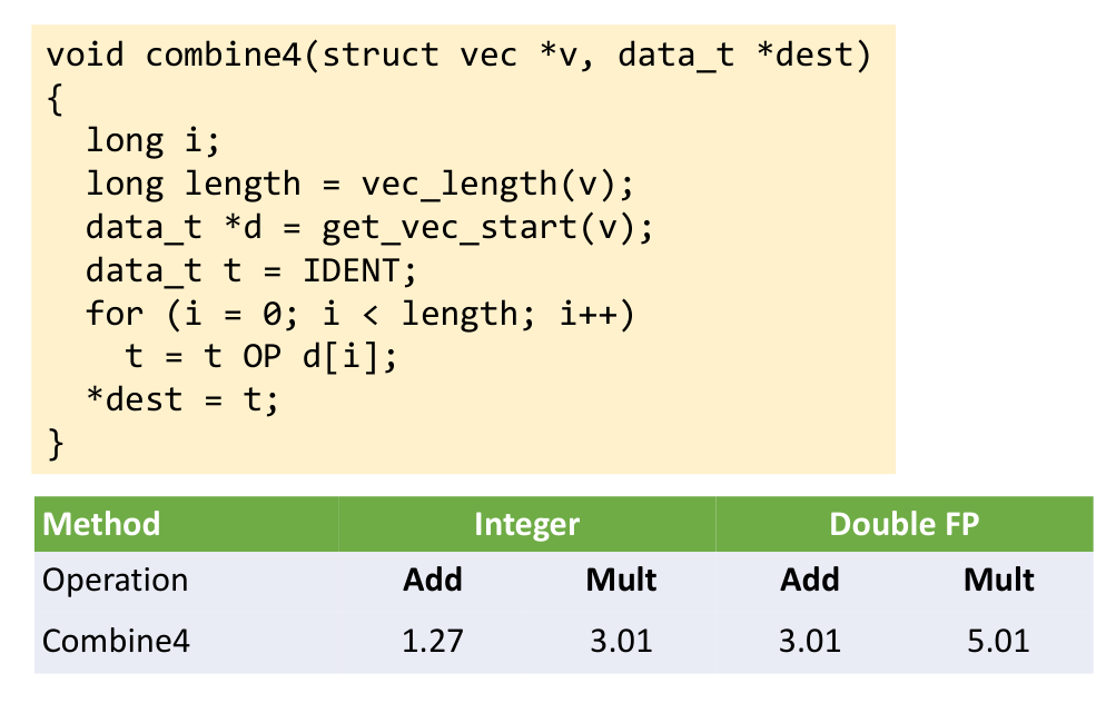 *dest = *dest OP val; // Optimization Blocker 3: Memory aliasing on dest