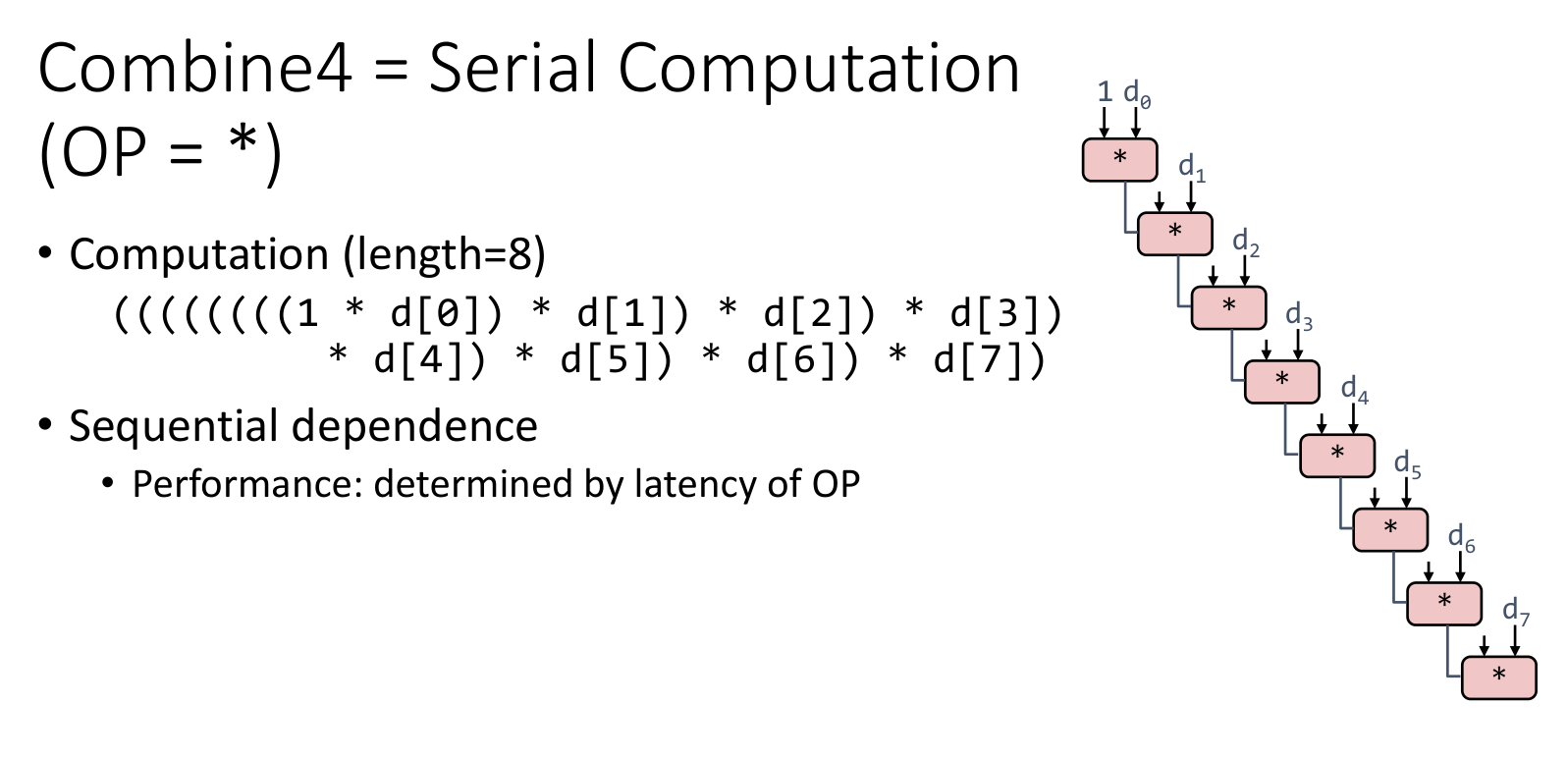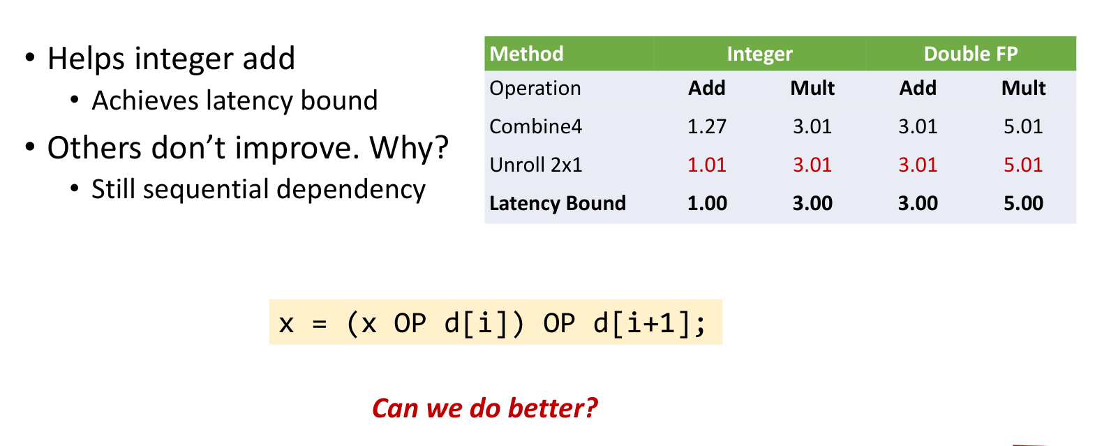 }Effect: This helps slightly with operations like Integer Addition (latency 1) by reducing loop index overhead. However, for FP Multiplication, the dependency chain is ((x * d[i]) * d[i+1]). The first multiply must still finish before doing the second. It does not break the latency bound.