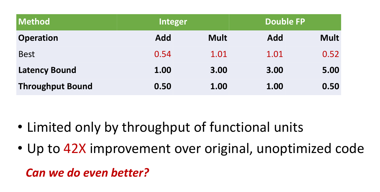- This can be scaled up (e.g., 10 accumulators) until the Throughput Bound of the functional units is hit.
