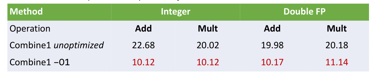 }As discussed in the previous chapter, combine1 is slow because of optimization blockers. Basic optimizations can be manually applied to create combine4.