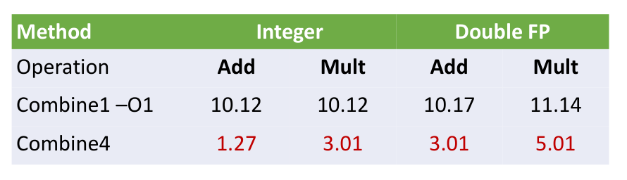 Going from combine1 to combine4 yields a roughly 2x to 10x speedup depending on the data type. But a wall is reached. For double-precision multiplication, combine4 stabilizes at 3.0 - 5.0 CPE. To go faster, understanding the hardware is required.