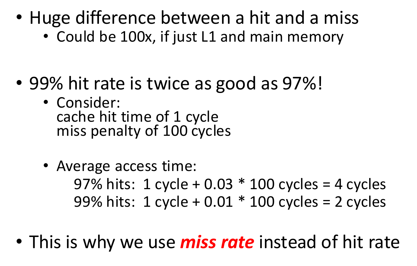Reducing the miss rate by just 2% doubles the average performance. This is why miss rates are the primary focus rather than hit rates.