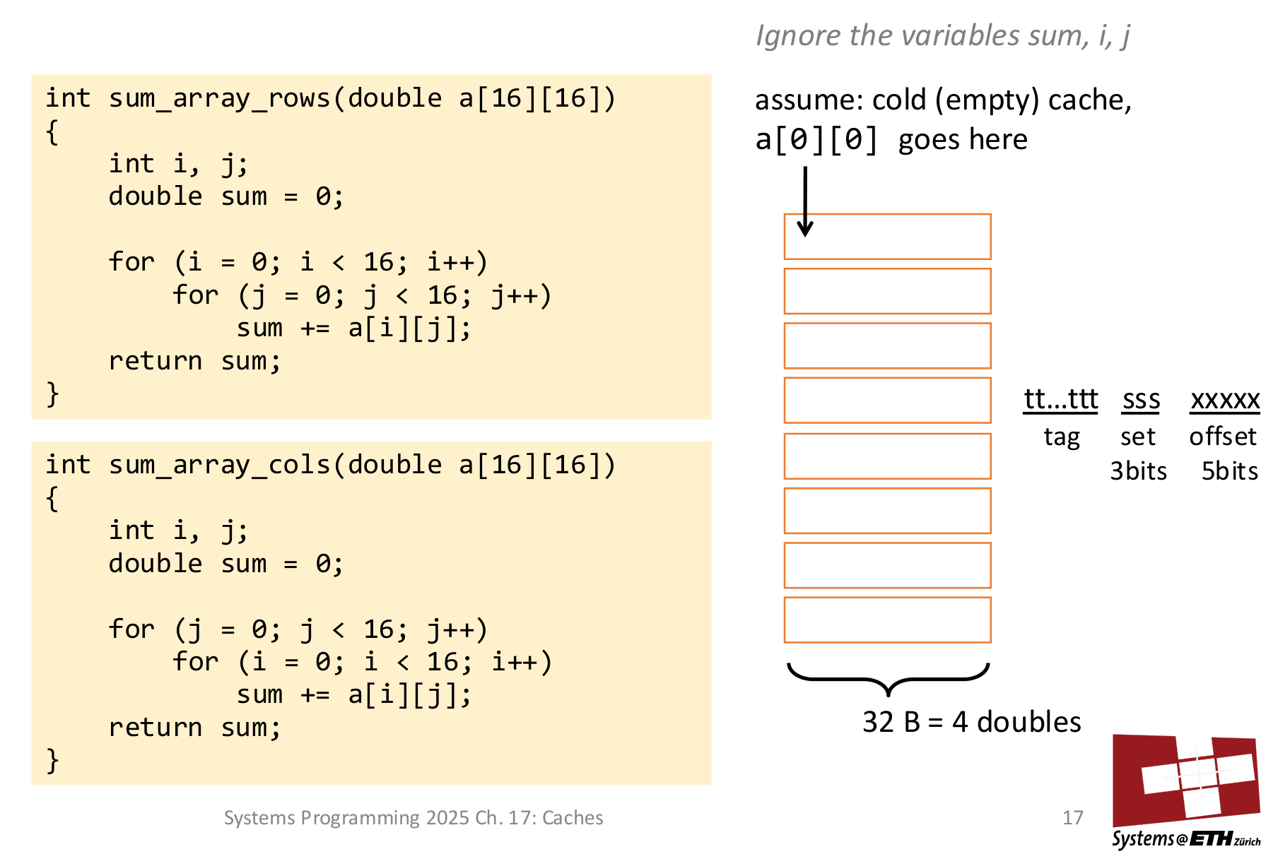 Let’s look at a concrete example of locality to understand the difference between cache organizations. Consider summing a array of doubles.