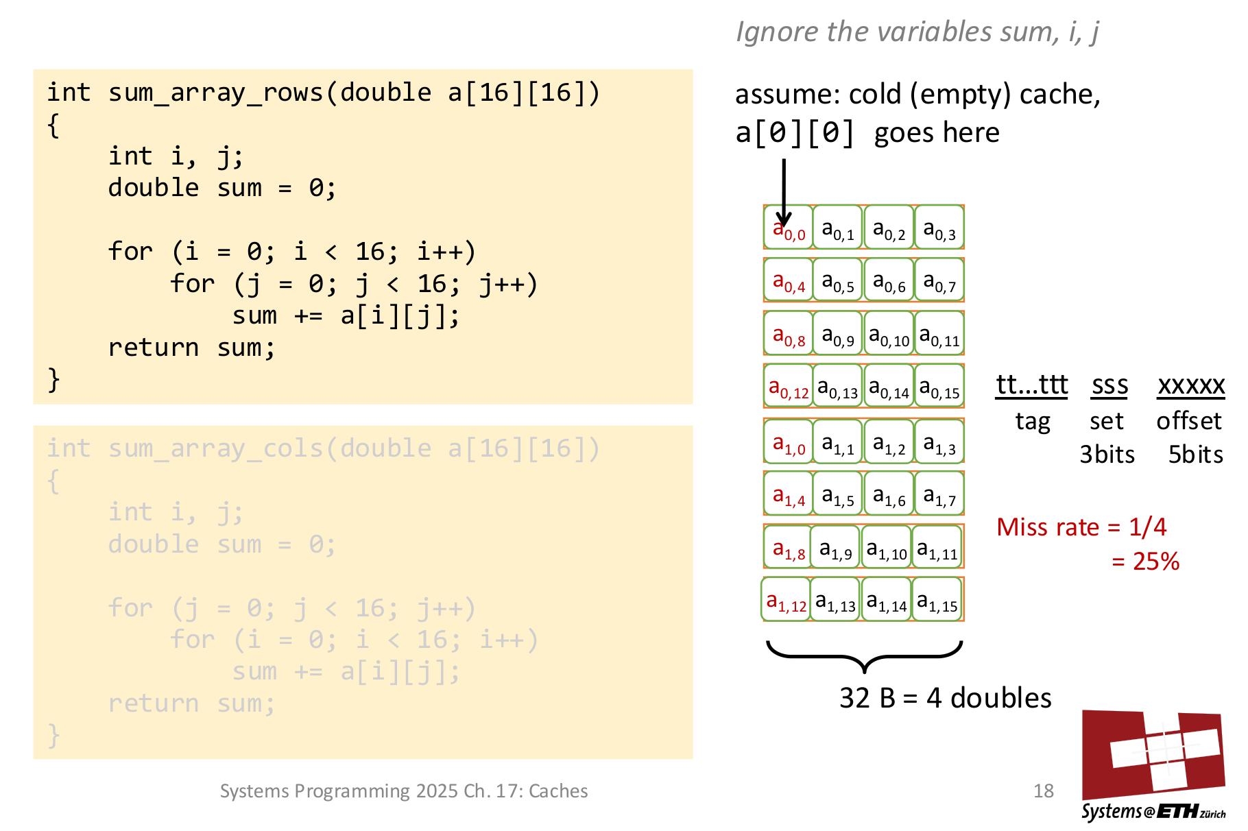 a[0][0]is loaded, but an immediate jump to a new addressa[1][0]follows. That block is loaded. By the time the column is finished and the program returns toa[0][1](the neighbor of the first access), the original block has been evicted. - Result: Every single access is a miss.