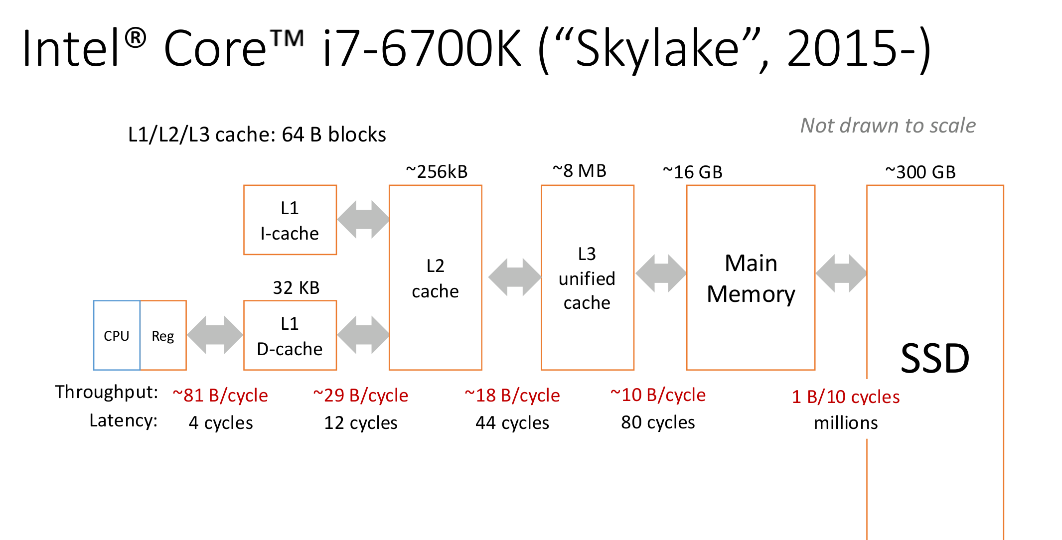 - The CPU: Can process roughly 512 Bytes/cycle (e.g., Haswell with AVX).