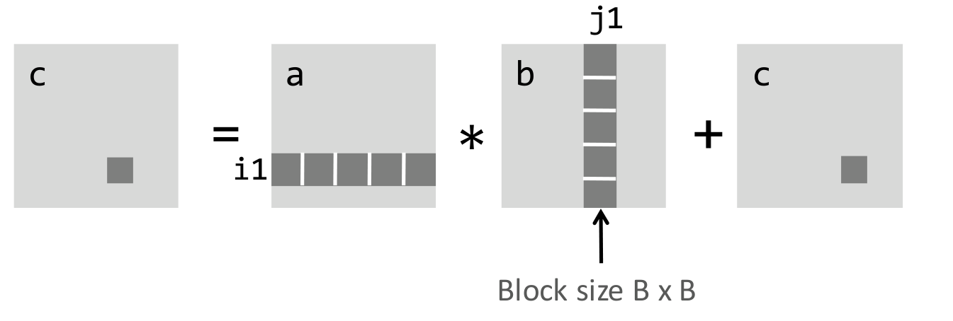 The Matrix-Matrix Multiplication (MMM) example () is revisited to demonstrate how code can be rewritten to exploit cache locality. This technique is known as Blocking or Tiling.