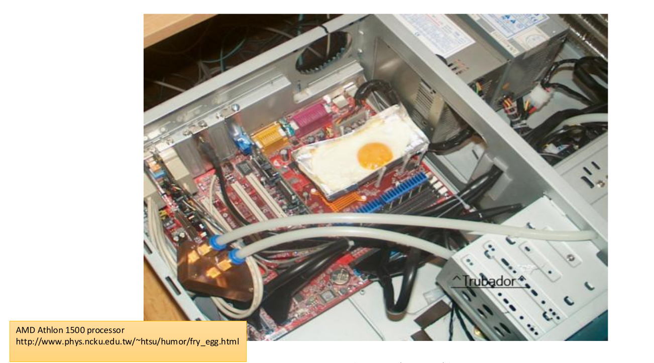 The floor on voltage scaling has been reached. Voltage cannot be lowered further because of Leakage Power (static power lost even when transistors are “off”). If cannot be lowered, cannot be raised without melting the chip.