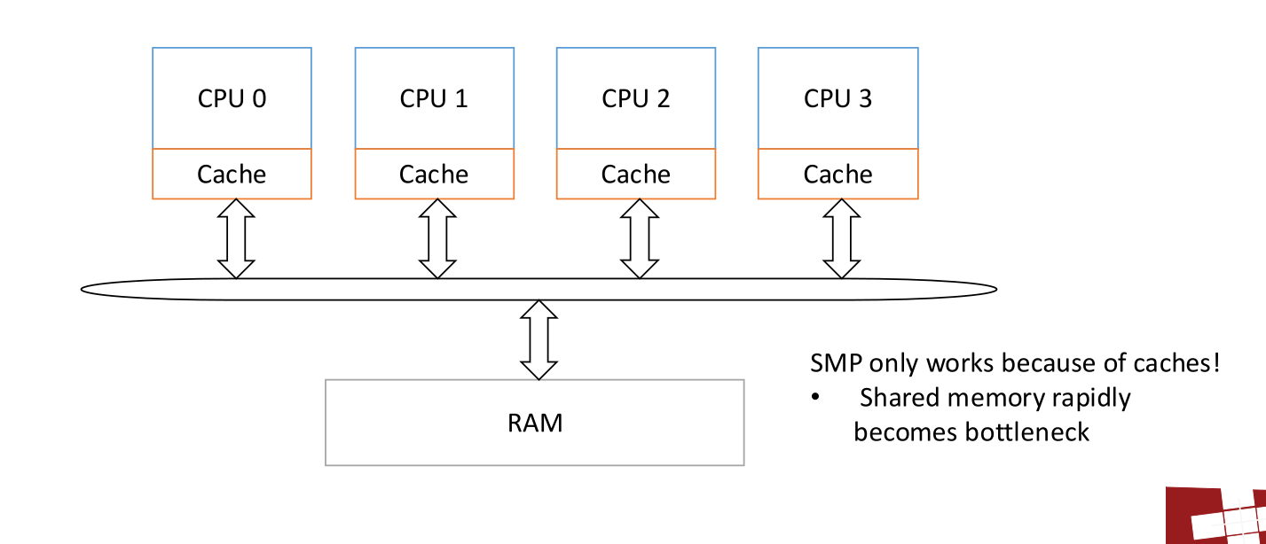 - Shared Memory: All cores connect to a single physical memory address space via a shared bus (or interconnect).