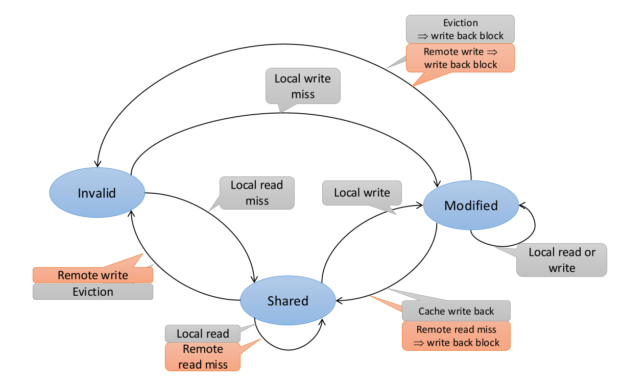 - Optimization: If a write to an E block is requested, the state can silently change to M without telling the bus. This saves massive bandwidth for private data.