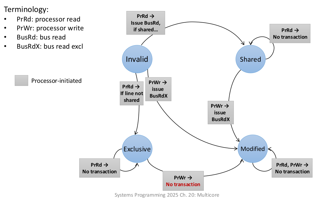 - MESI behavior: Data must be flushed to RAM (slow). The other core reads from RAM. Both go to S. RAM is now up to date.
