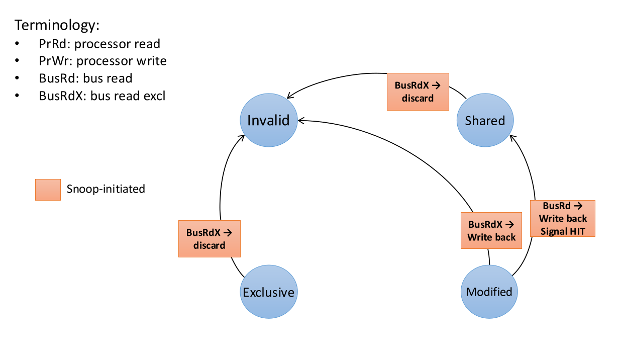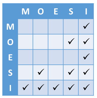 State Valid? Exclusive? Dirty? M Yes Yes Yes E Yes Yes No S Yes No No I No - -
