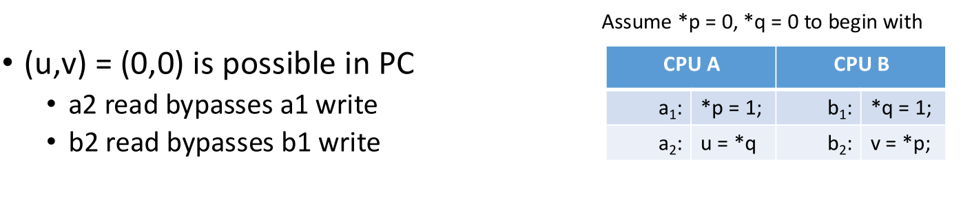Example: Two cores update separate variables and then read the other’s variable. In TSO, it is possible for both to read the old value (0) because both writes are stuck in their respective write buffers. This is impossible in Sequential Consistency.