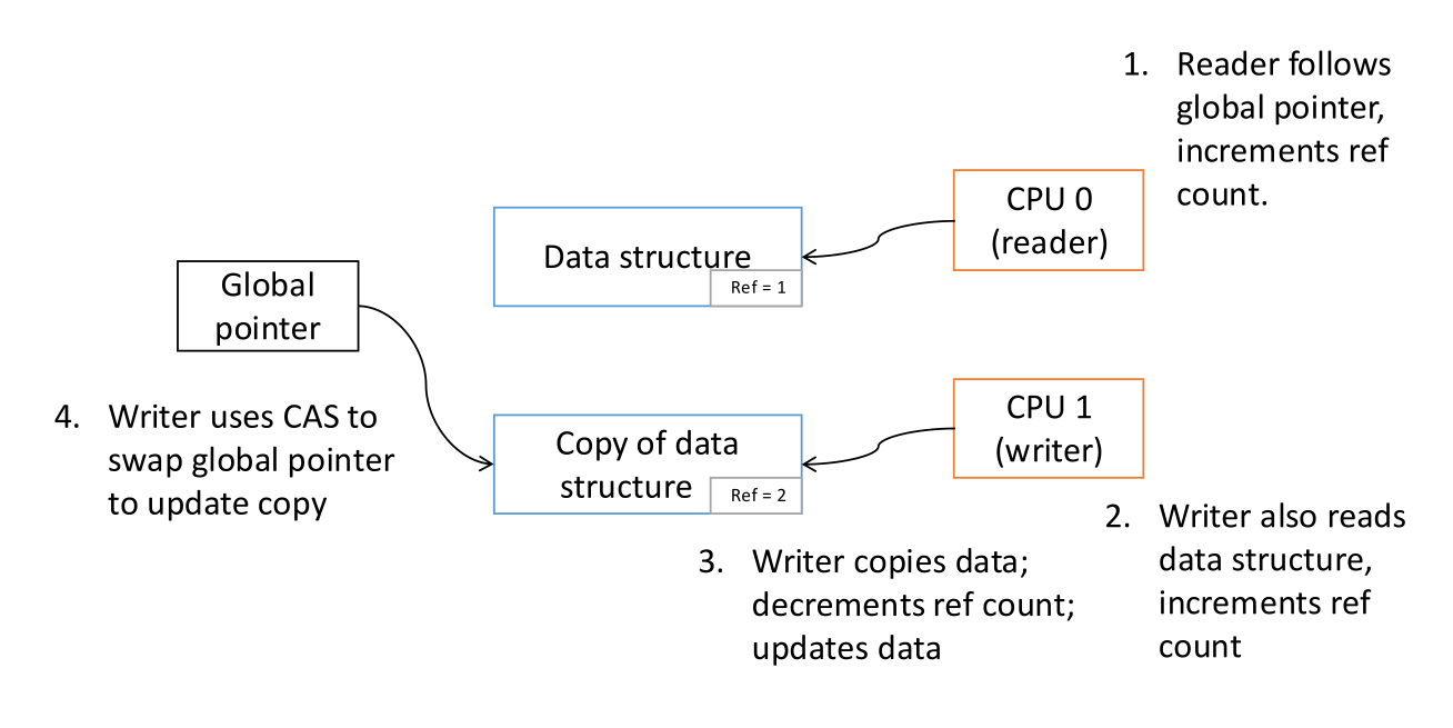 Instead of locking a data structure, it is possible to optimistically try to update it. A common pattern is Read-Copy-Update:
